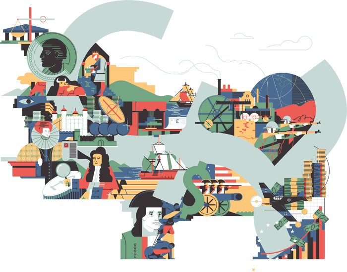 An editorial illustration that accompanies an article about the history of the British Pound.