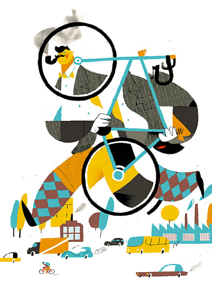 A poster for a bicycle Retro Cruise in Kyiv. Original style! Patterns on the socks and jacket are simply fabulous.