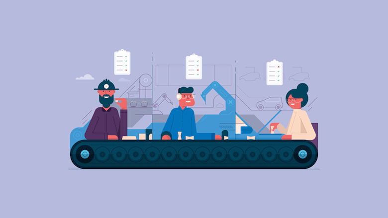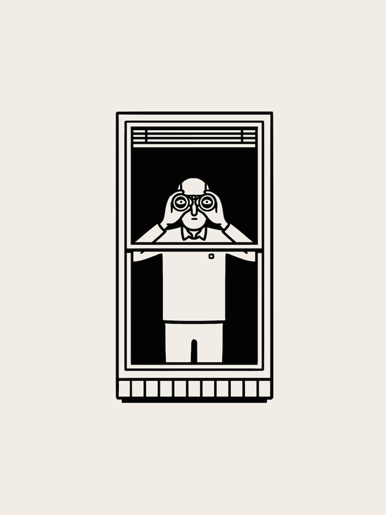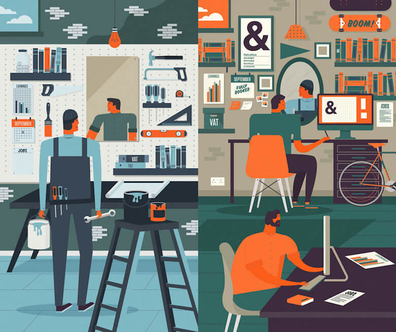 Editorial illustrations about self-employment. Two characters from white and blue collar jobs look at each other within a mirror. I can keep looking at this one for a while. Love all those little details, objects etc.