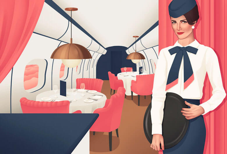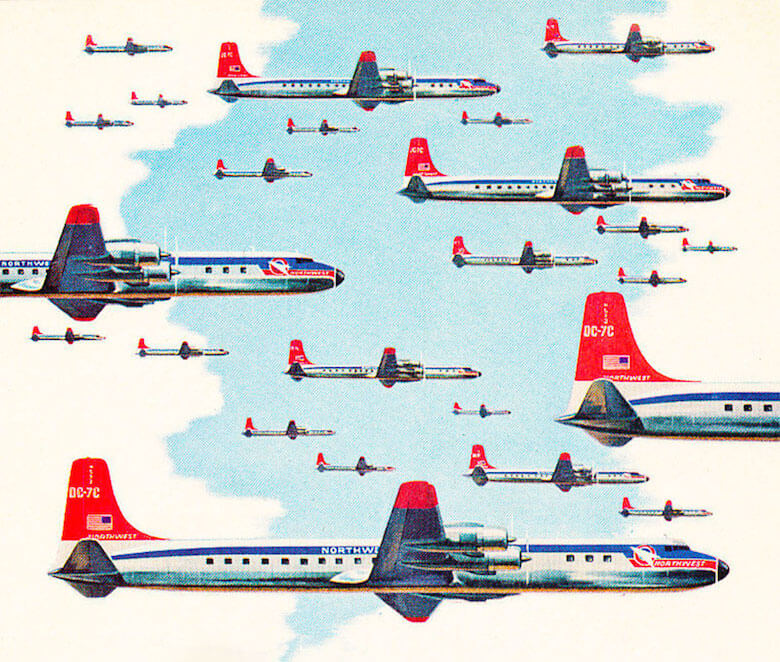 I’ve always admired those vintage illustrated ads. This is one is from 1957 for the Northwest Airlines Fleet.