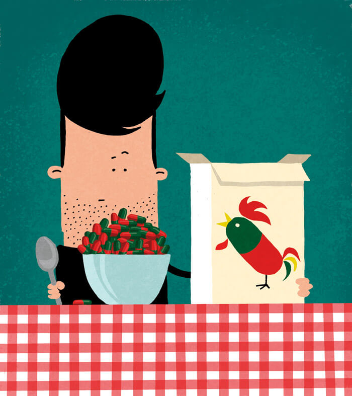 Illustration to accompany an article in a newspaper about food supplements. It’s always refreshing to see how an illustrator translates it. Love the shape of the rooster.
