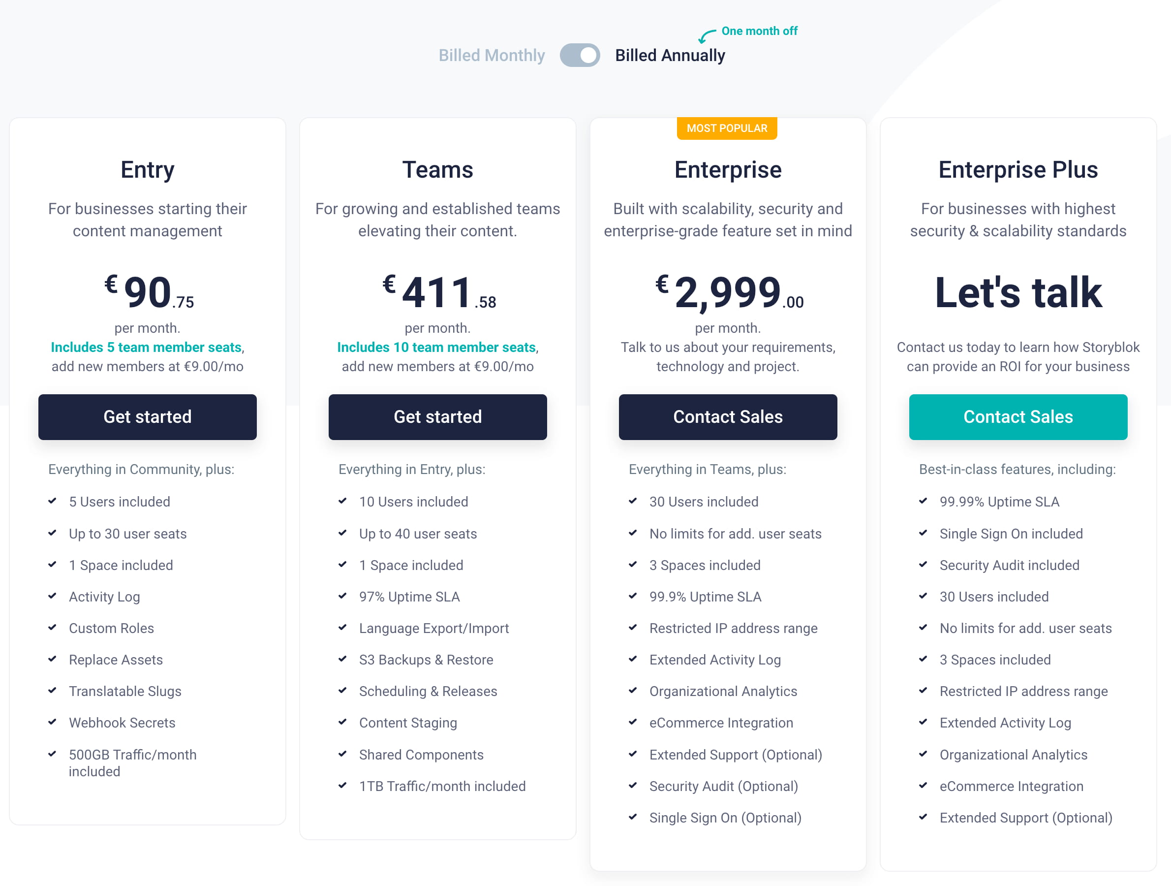On Contentful, the pricing page doesn’t set focus on a lengthy feature comparison table; instead, the three main plans are highlighted at the top of the page, with just a few key distinguished features. The fully-fledged feature list is also available, but further down the page, rather than being the front and center of the experience. That’s simpler and better.