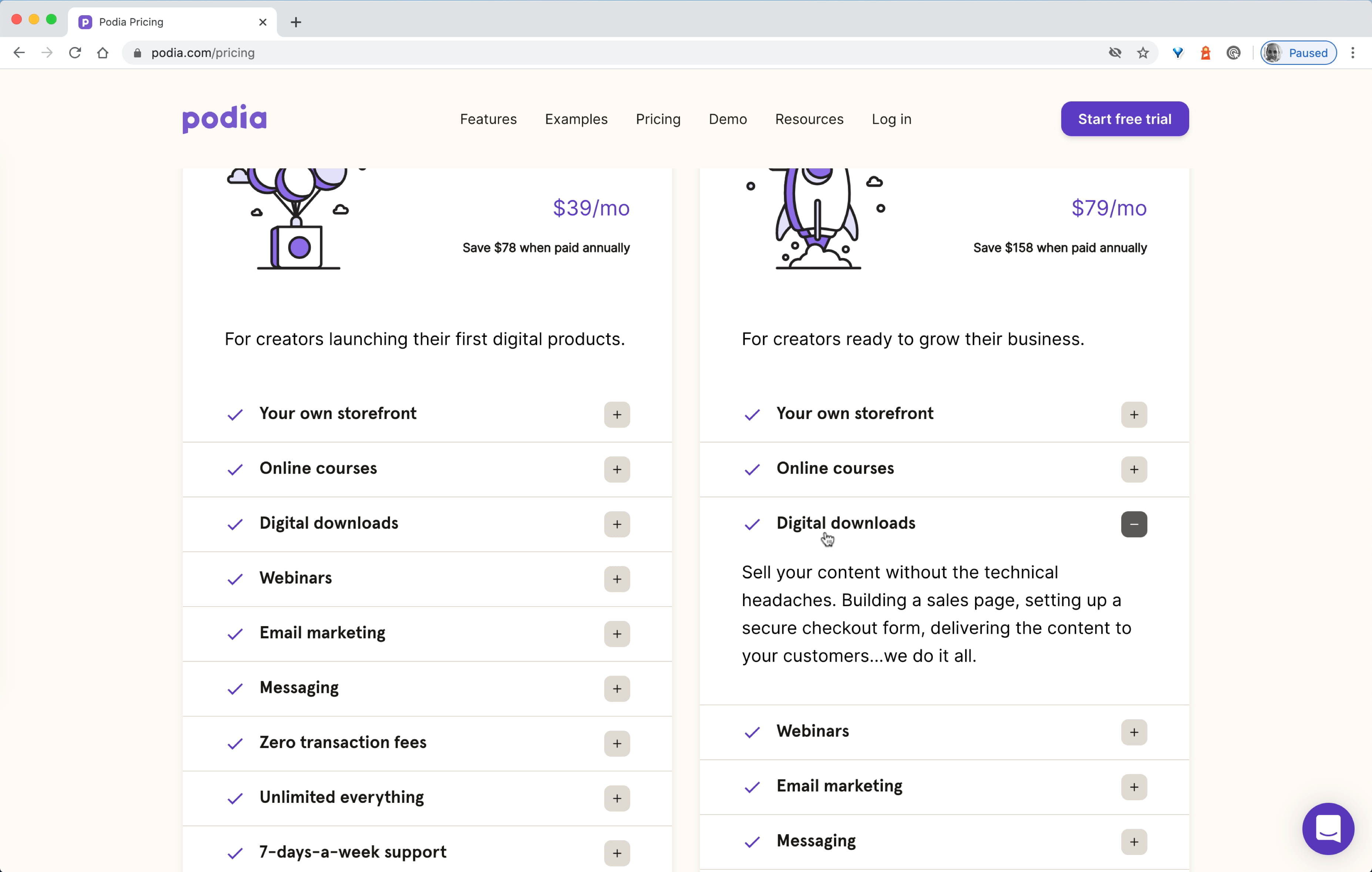 You might have seen a common thread in the examples above. Indeed, at this point, it’s worth mentioning that tooltips are problematic; they cover content and require focus trapping, and if could replace them with accordions, we probably should. This goes hand in hand with the Podia example featured below.