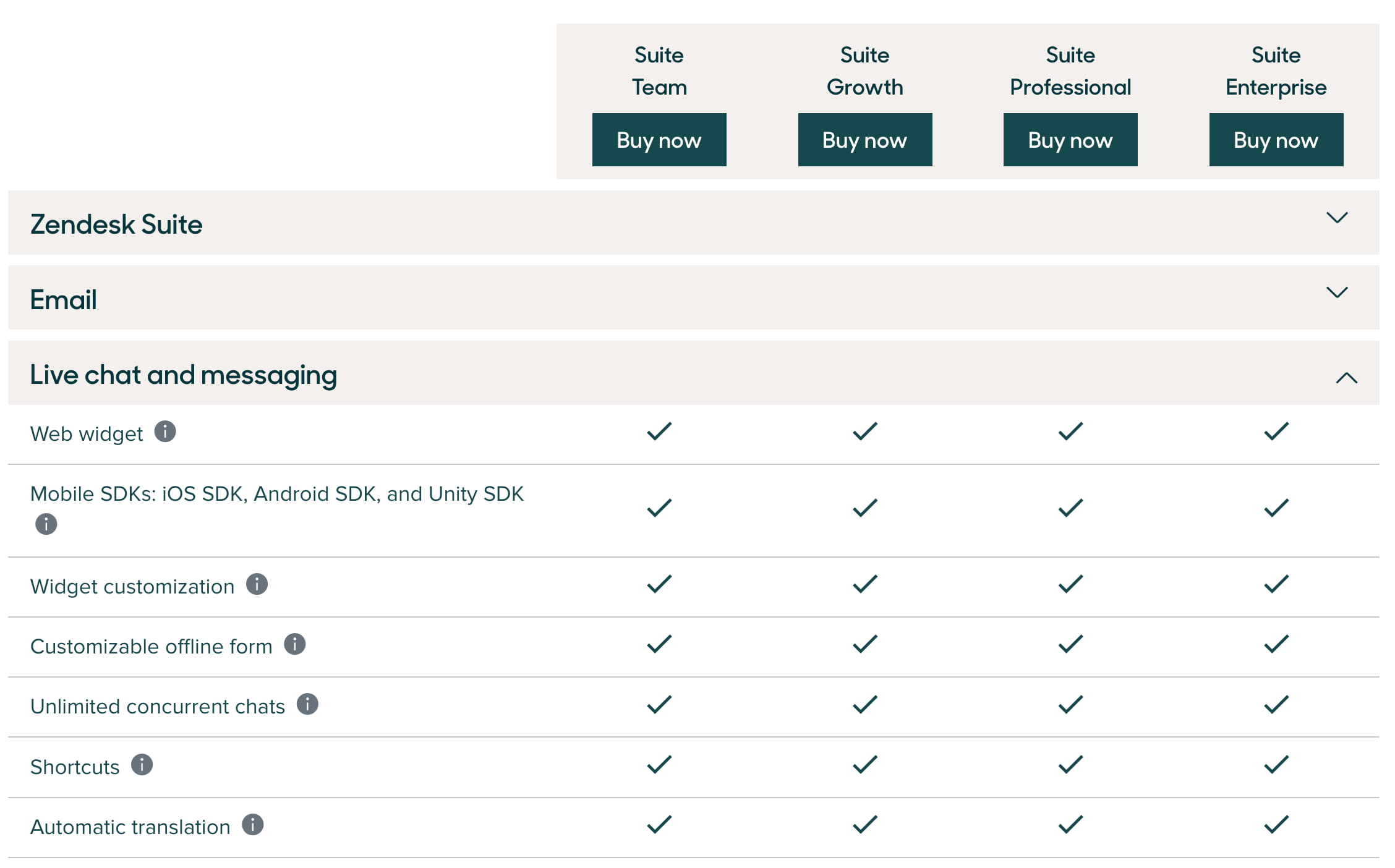 On Zendesk, all features are grouped and packaged into accordions that can be open and collapsed at once. This allows for a faster scan of categories and makes the full list of features slightly more manageable.