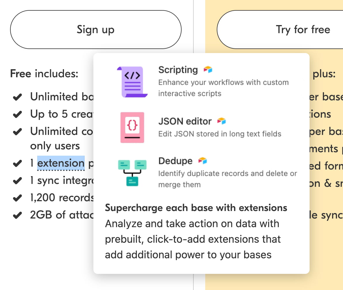 On Airtable, not only text hints but also visual previews appear on hover, including short animations that highlight and explain a feature. Unfortunately, there are no focus styles, nor are featured keyboard-accessible, so navigating between the features in a table is difficult.
