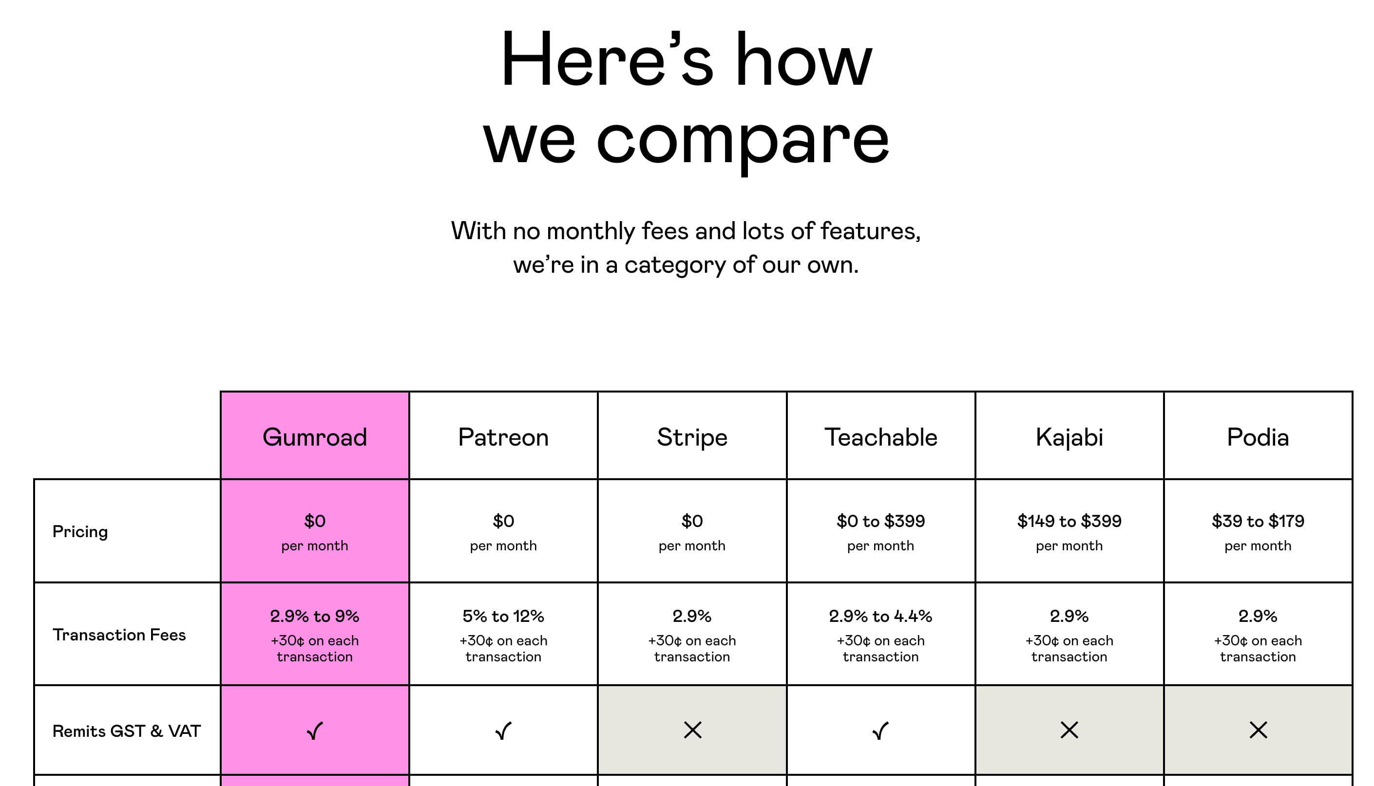 Gumroad provides a competitive matrix comparing their pricing with the pricing of their main competitors. So does Basecamp.