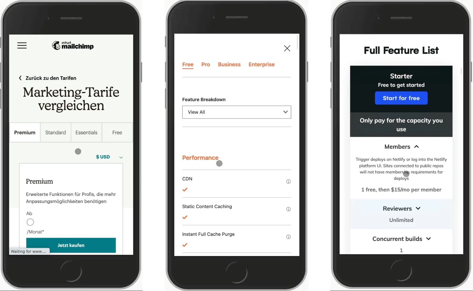 On Netlify, as you scroll down the page, all features are repeated multiple times, with a new section appearing as a sticky bar on the top, and hence indicating what the current plan is. On Hubspot and Chargebee, a modal view with a drop-down is used to jump between the plans. That’s quite a bit slower compared to tabs and usually not really necessary. It’s a good idea to see them here as the method of last resort.