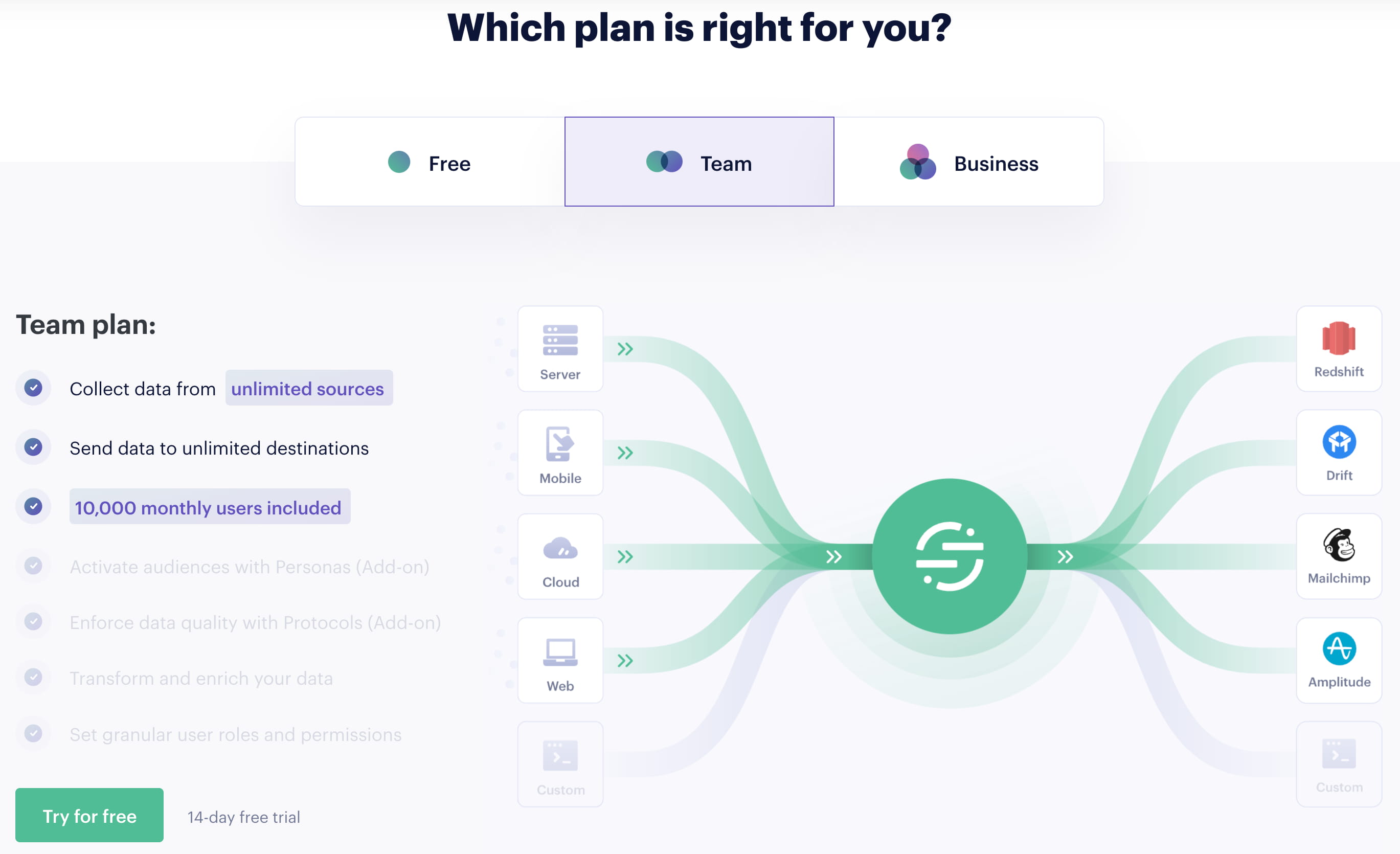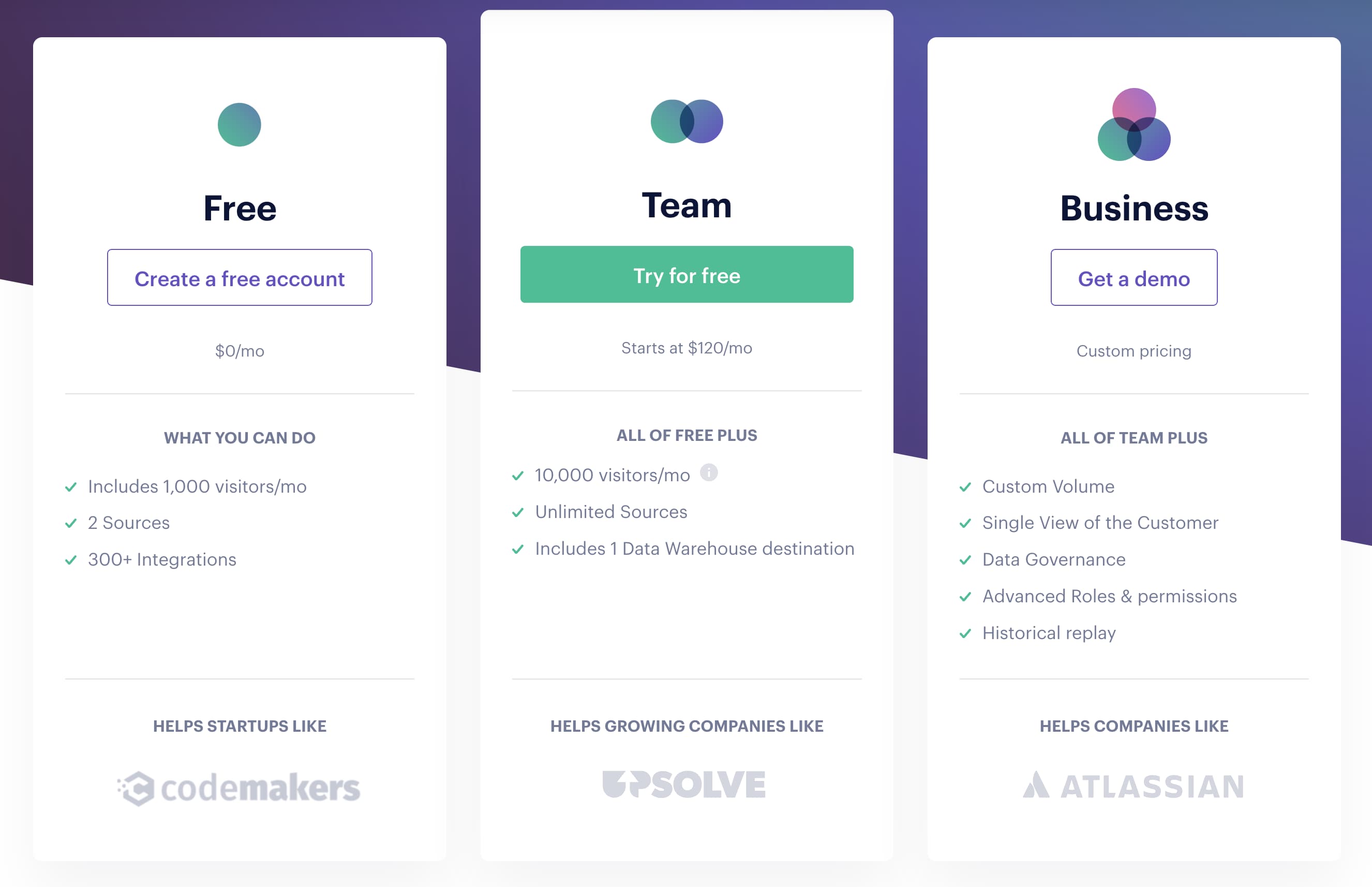 Alternatively to a comparison matrix, we could try to visualize differences between plans within tabs, with a few animations that would explain a particular plan. Twilio Segment does just that. As users switch between tabs, the list of features is updated. This isn’t quite a side-by-side comparison, but it might be good enough to visualize how plans differ.