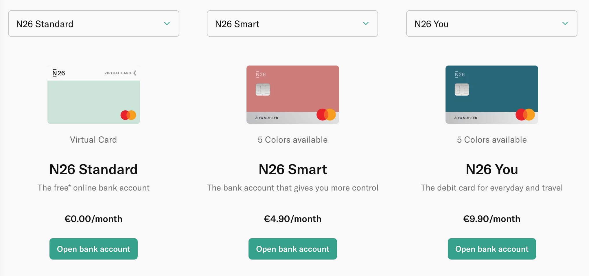 An alternative way to display plans is to allow users to choose which plans appear to be most relevant to them. N26 displays a drop-down menu — which allows users to choose which plans they’d like to study side-by-side. Depending on user’s screen, customers can compare up to 3 plans at once.