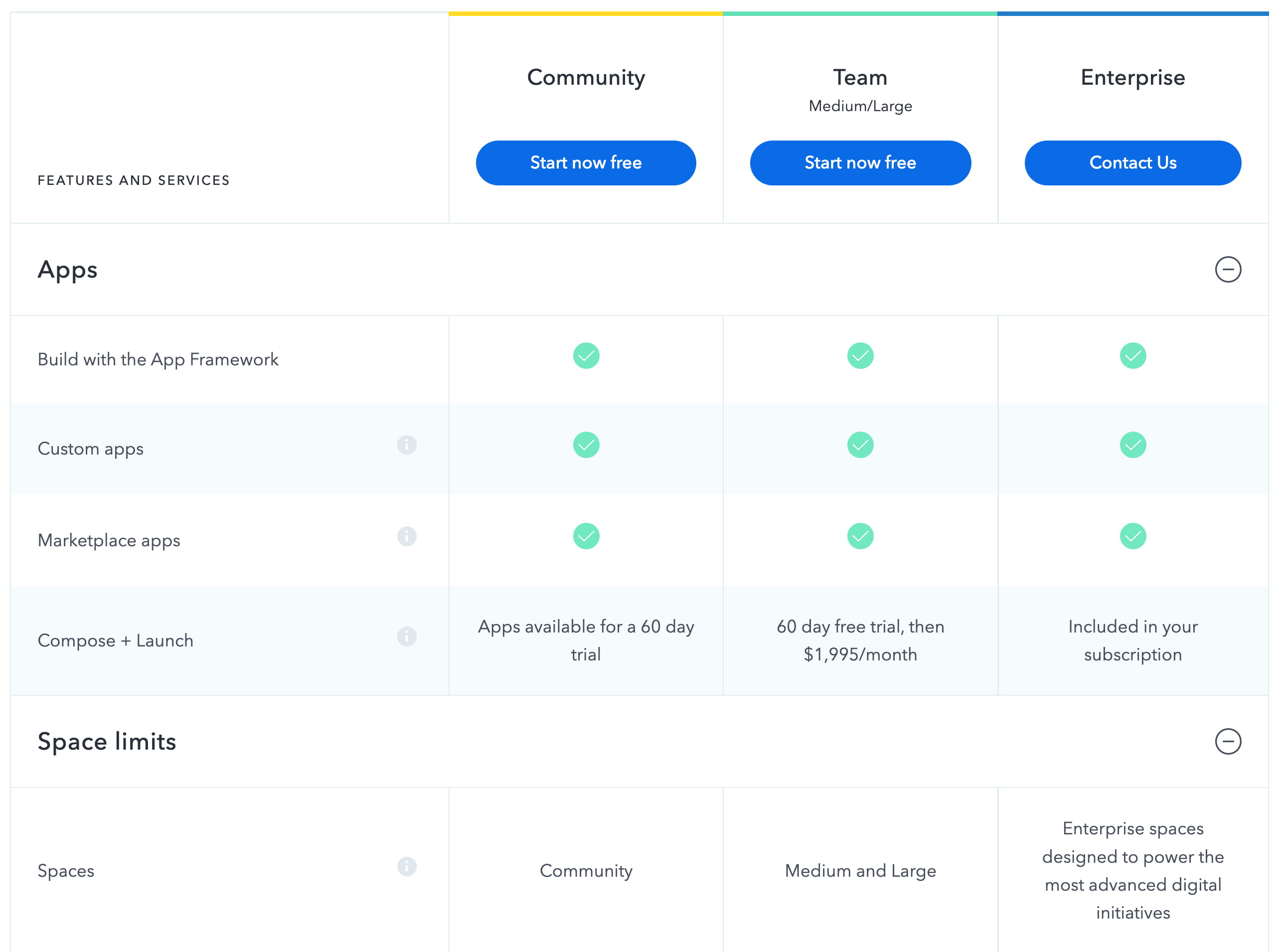 Since users often rely on table headers to verify that they are studying the right pricing plan, we can help them keep the headers in view at all times. We do so by making headers floating as users start scrolling down the page in a comparison table. Contentful’s pricing page does just that. Both the title and the call to action are floating on top of the feature comparison matrix.