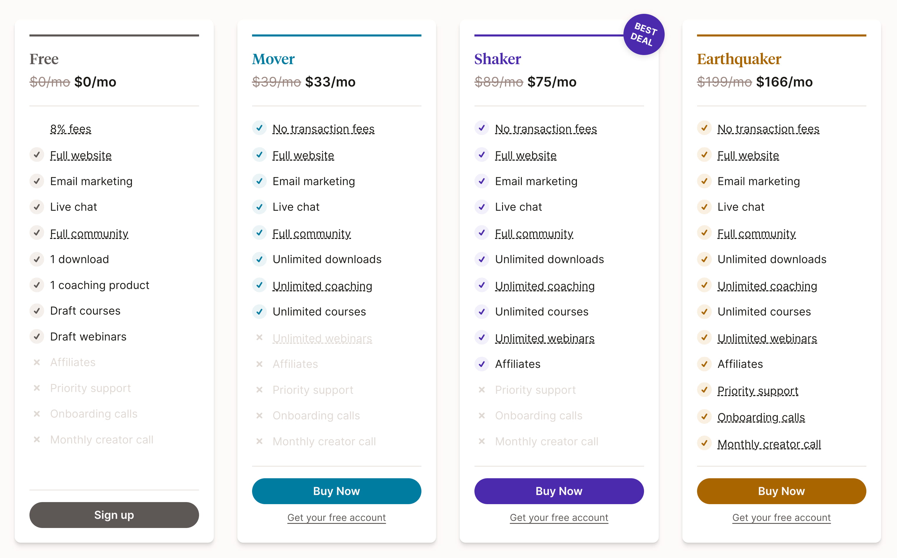 In many examples above, features from one plan are fully included in the list of features from a higher-tier plan, but sometimes it’s not the case. You might have differences in charging fees or slightly different limitations depending on the select plan. In that case, you can follow Podia’s example and hide unavailable features. While the contrast could be increased quite a bit, it makes it easy to compare each plan by scanning each row individually.
