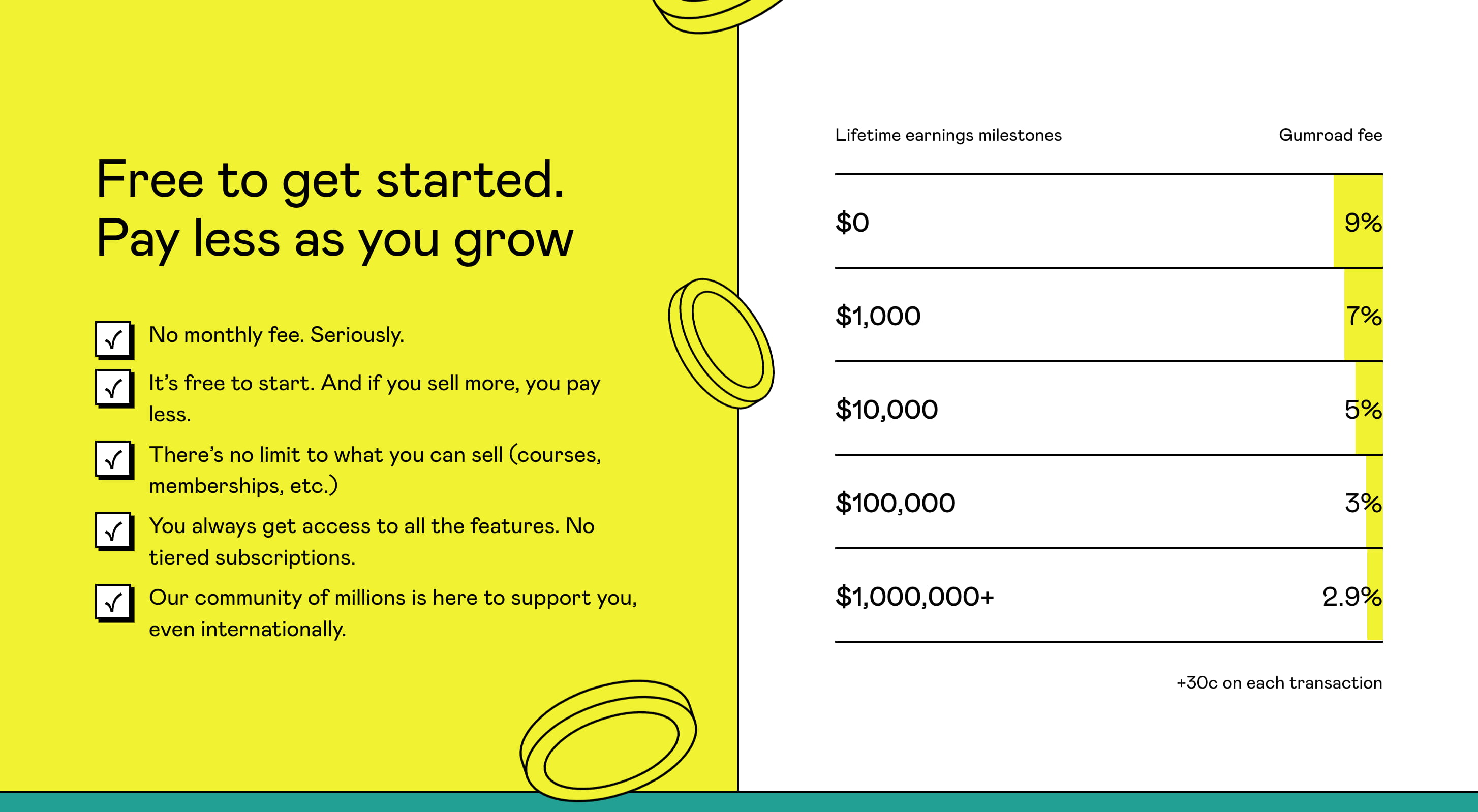 Gumroad doesn’t leave any chance for any concerns. On their pricing page, a large area explains how the service works and what the pricing plan entails, along with a pricing example next to it.
