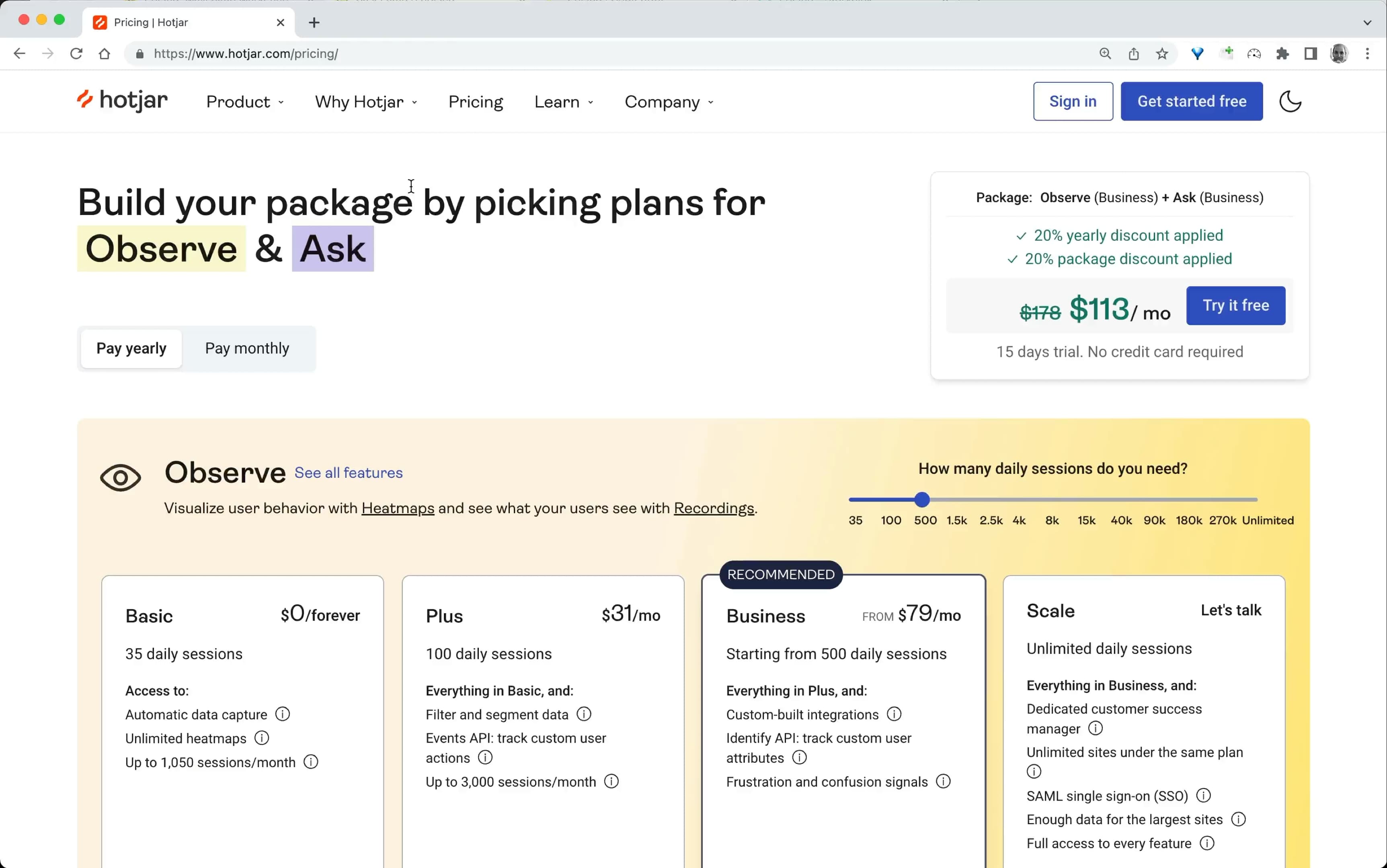 Hotjar changes its pricing based on whether packages are being used and based on how many daily sessions are expected to be used.
