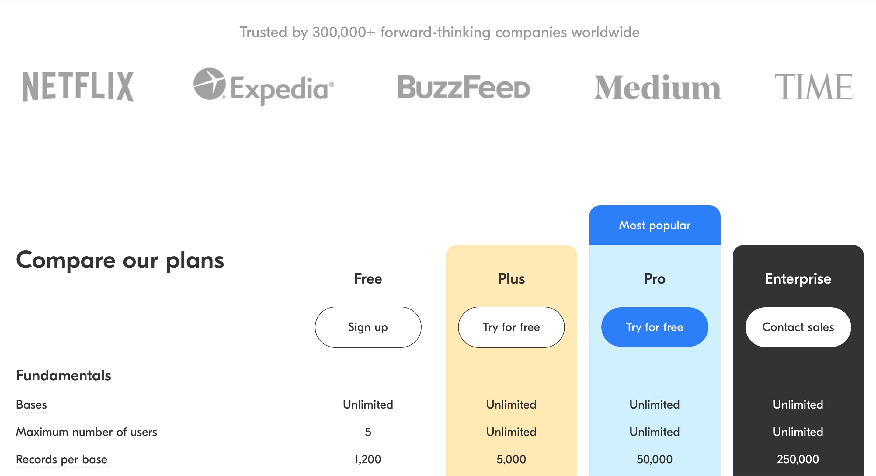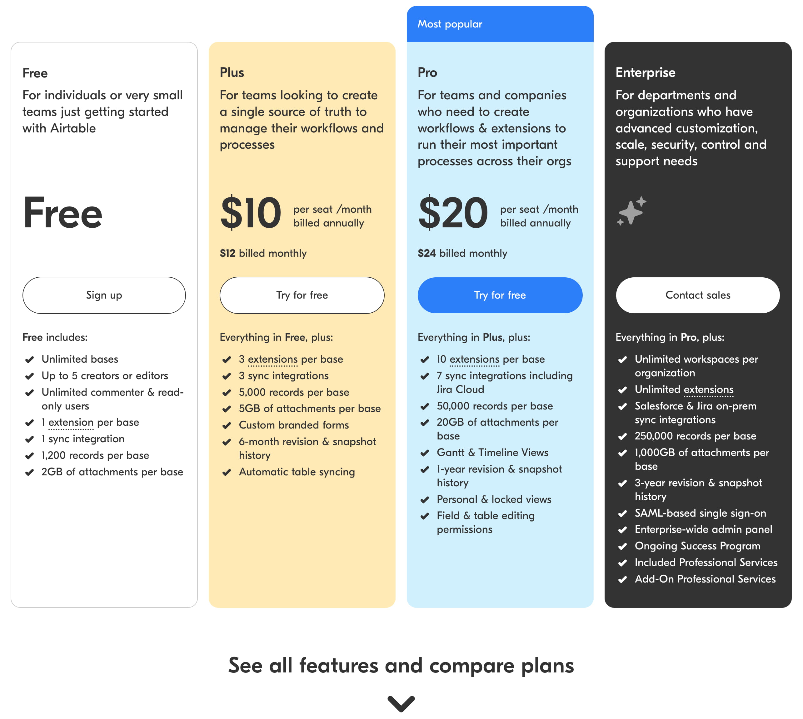 Airtable shows a few more features in a dense, compact view. With a bit of color-coding, each plan is highlighted slightly differently with a different background color. Notice that all prices, calls to action, and lists of features are aligned, so scanning the table is relatively easy. The list of all features and a plan comparison appear further down the page.