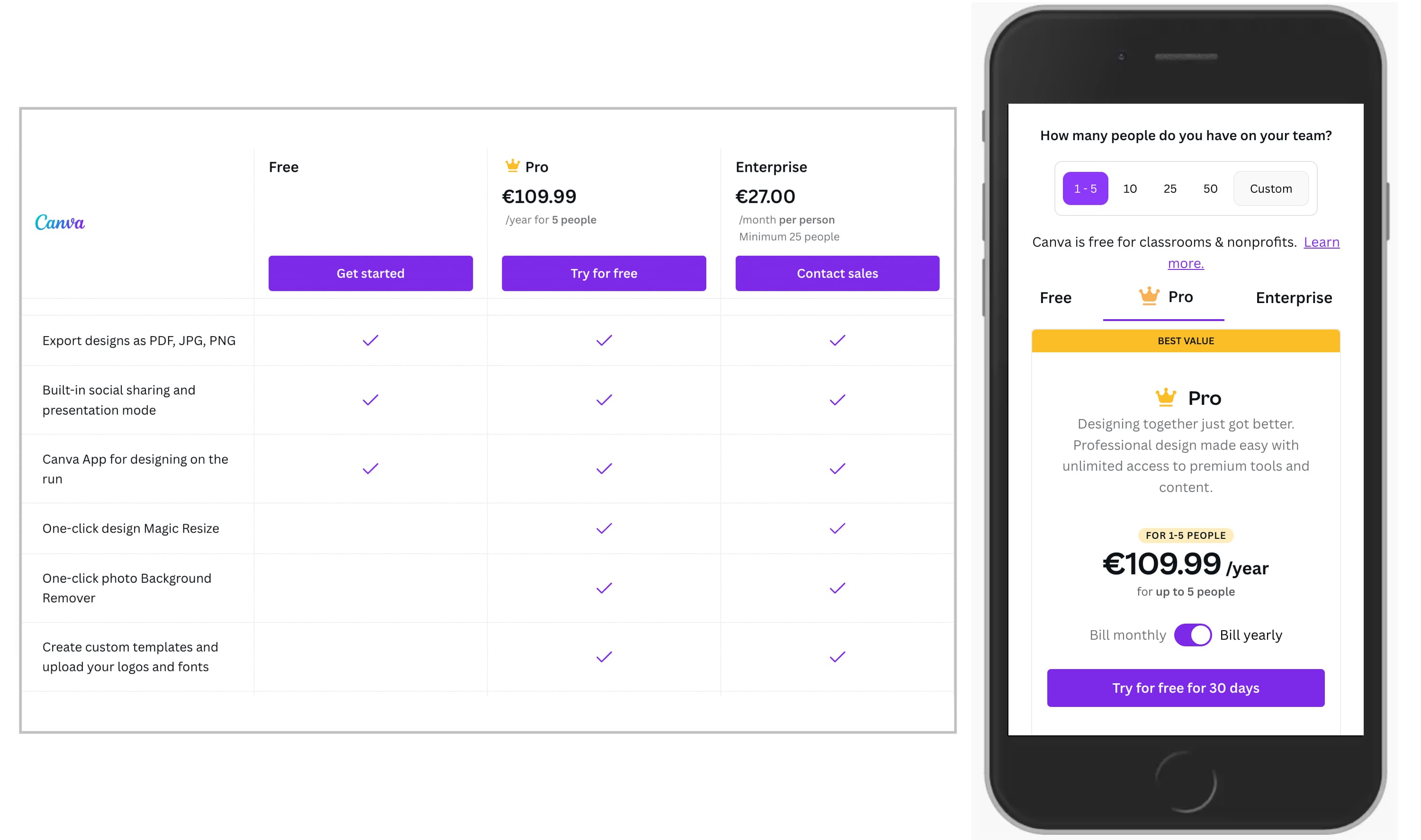 If you have a relatively simple product, perhaps with just under 20 features, you might not need a feature comparison matrix at all — Canva avoids it on mobile and uses accordions instead, while on desktop, the comparison table does make its appearance.