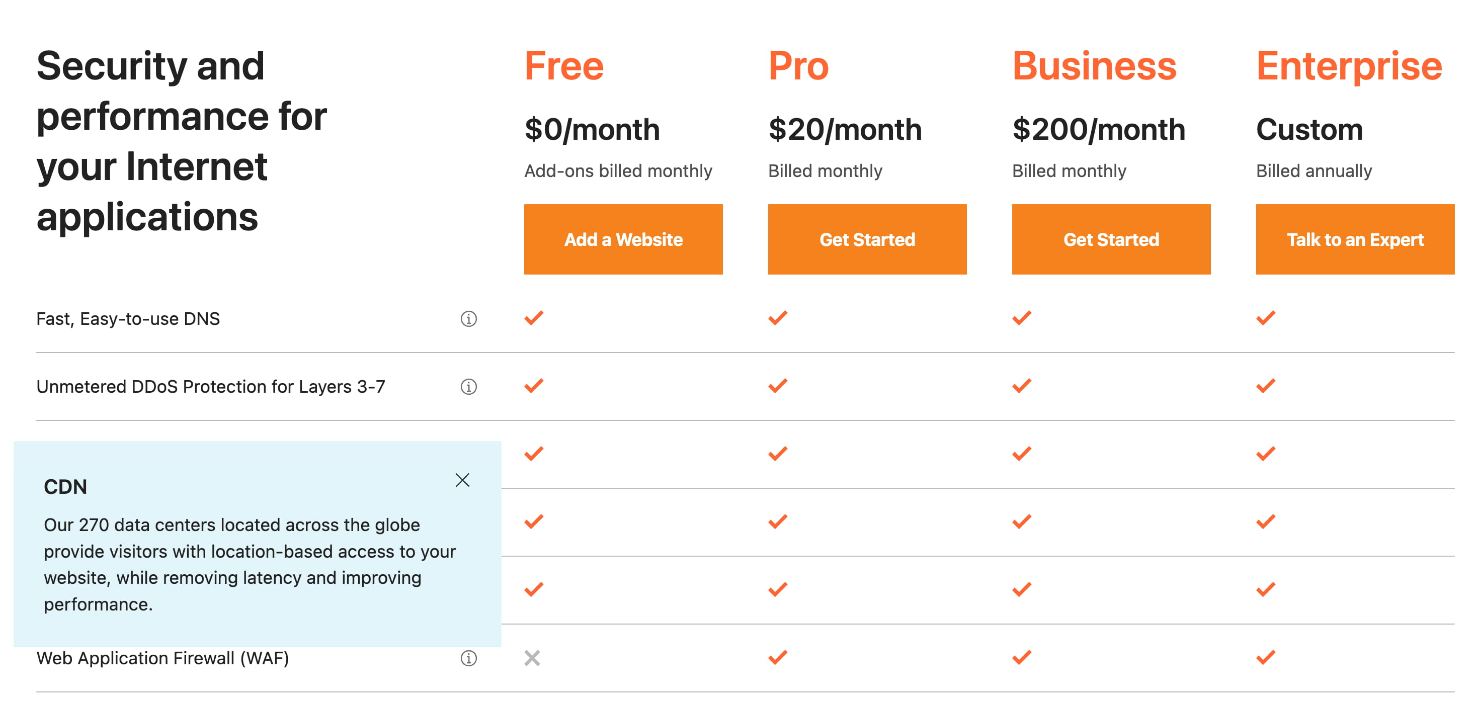 On Cloudflare, tooltips cover features listed further down the list, making it difficult to move between features quickly. Also, notice that the position of the “info” icon doesn’t match the position of the “close” button in the tooltip, which slows down users who want to explore many features quickly.