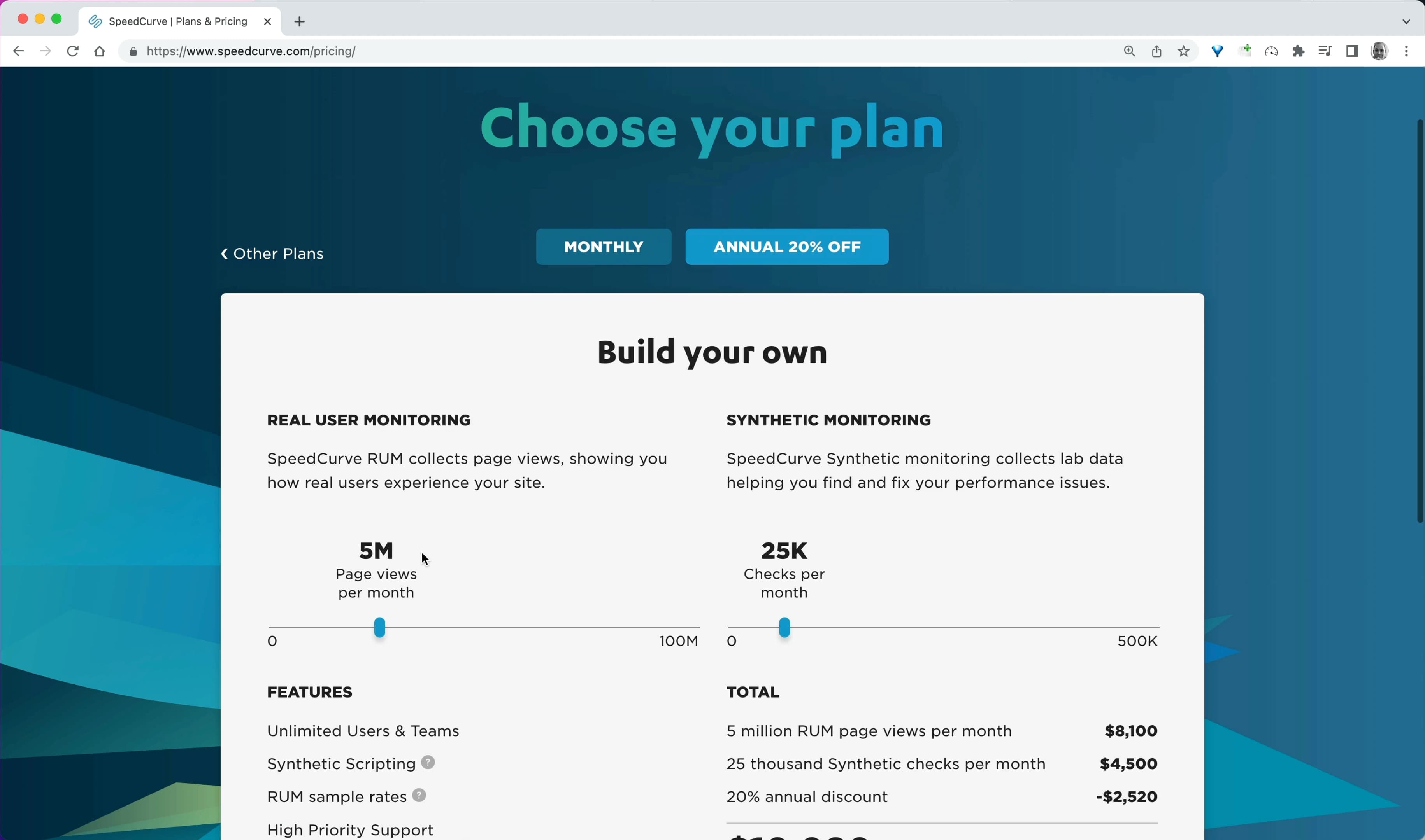 Speedcurve allows users to build their own plan by specifying the amount of page views per month and the number of checks per month.