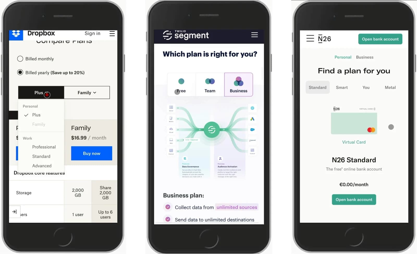 But it’s not necessary to allow users to see only one plan at a time. In fact, it’s likely that at least two plans could be displayed side-by-side. We can allow users to choose the plans of interest and show them next to each other. That’s the approach that Dropbox uses on mobile. Customers can choose 2 plans from the list of 5 existing plans and compare them side-by-side. Both Twilio Segment and N26 use tabs and swiping gestures to move between plans.
