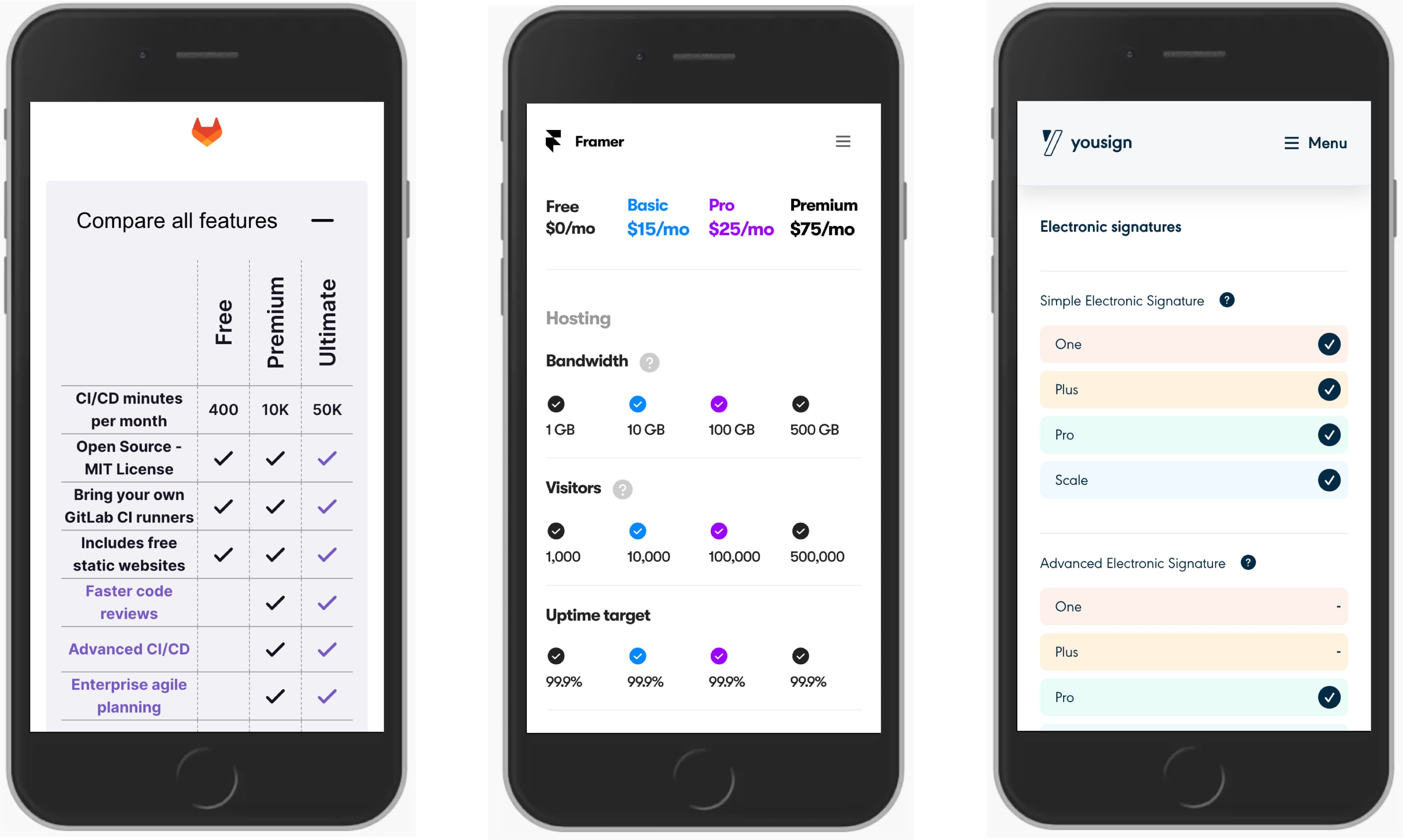 Finally, another way of managing a feature comparison matrix is by either tilting headings (Gitlab), or showing attributes on a separate row to make space for the 4 pricing plans values to appear in one single row (Framer) or arrange all attributes vertically, one under another, one row at a time (Yousign). These all are fantastic options to avoid horizontal scrolling and make a feature comparison slightly easier to perform.