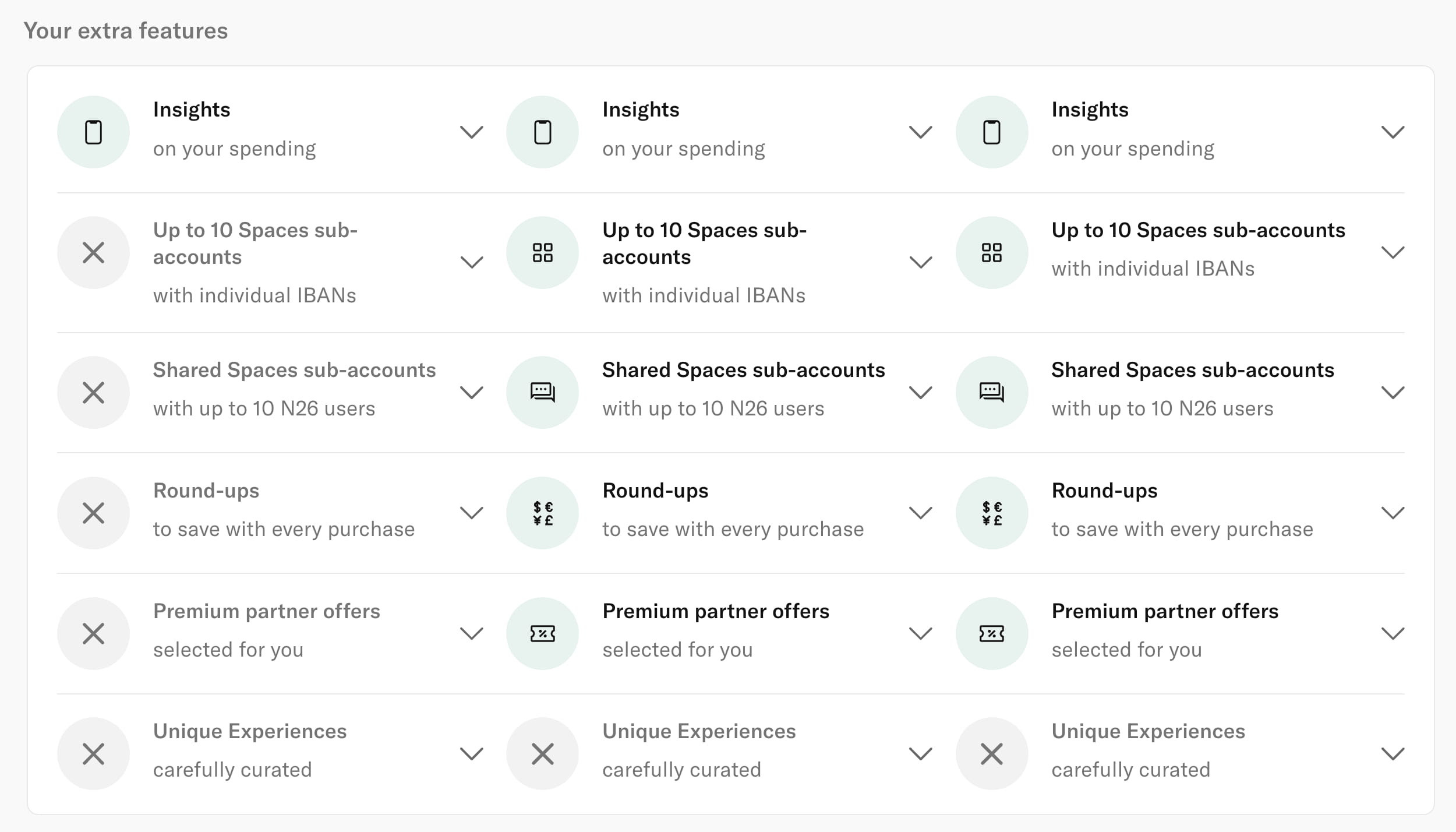 N26 follows suit by highlighting both available and unavailable options in the same row. Each row can be expanded with a click on one of the chevrons and provides more details about each feature.