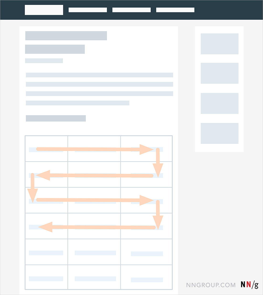 Usability studies show that users often rely on the lawn mower pattern when exploring feature comparison tables. That means that they begin in the top-left cell, move to the right until the end of the row, then drop down to the last cell of the next row and move back to the left until the end of the row.