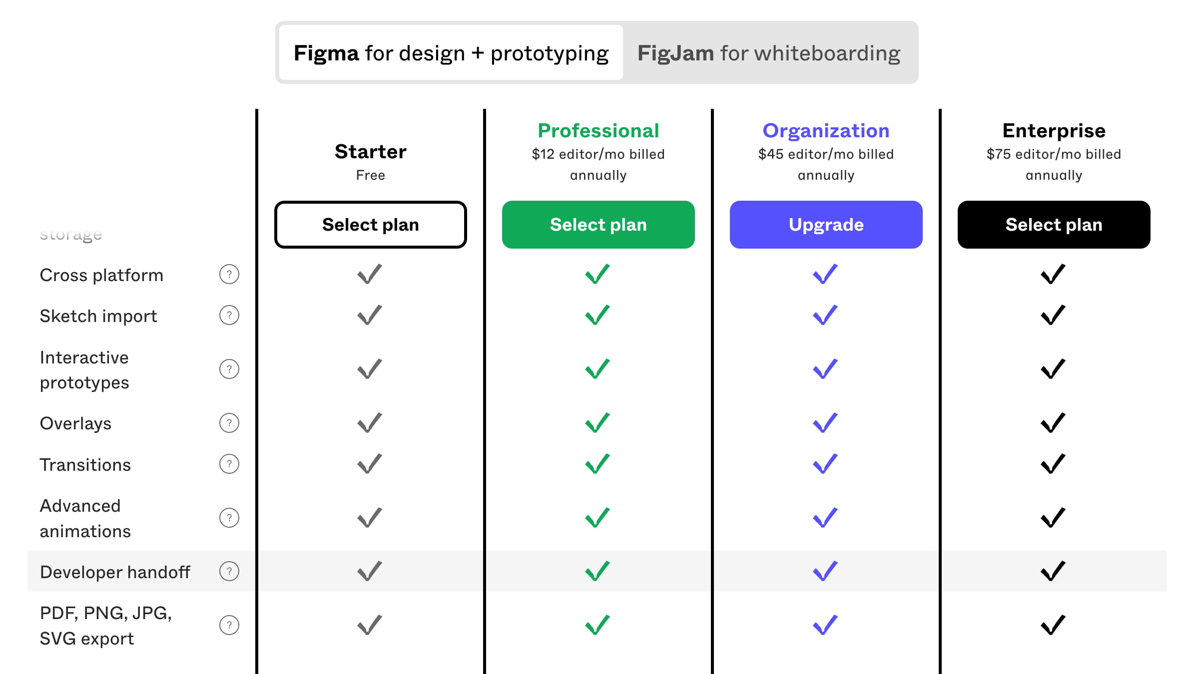 Figma also sticks to floating bars. Additionally to pricing and calls to action, there are also tabs at the top, allowing users to switch between offered tools.