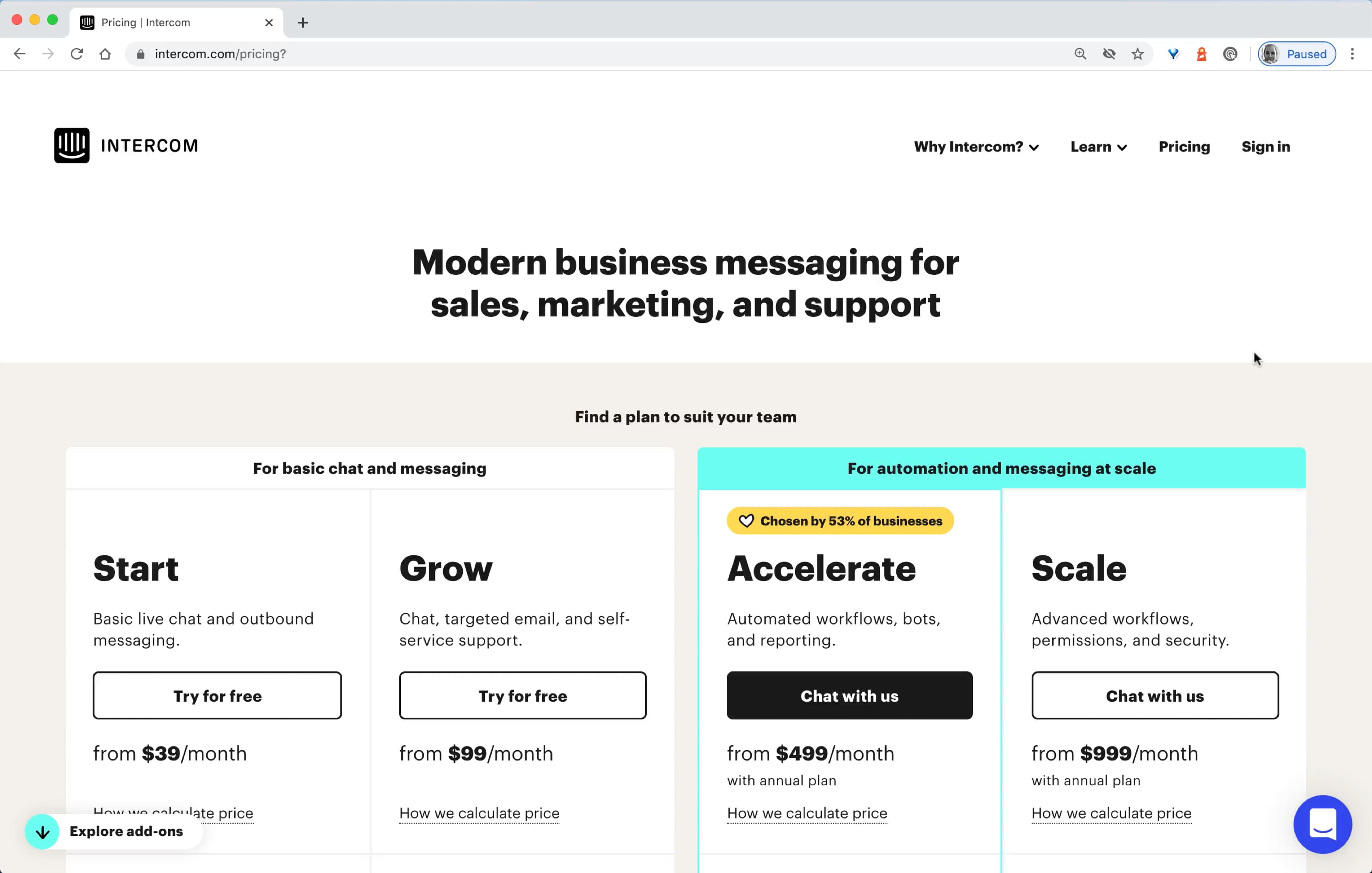 Intercom focuses on add-ons and extras that can be added to the basic plan. This gives users an overview of the final price early on.