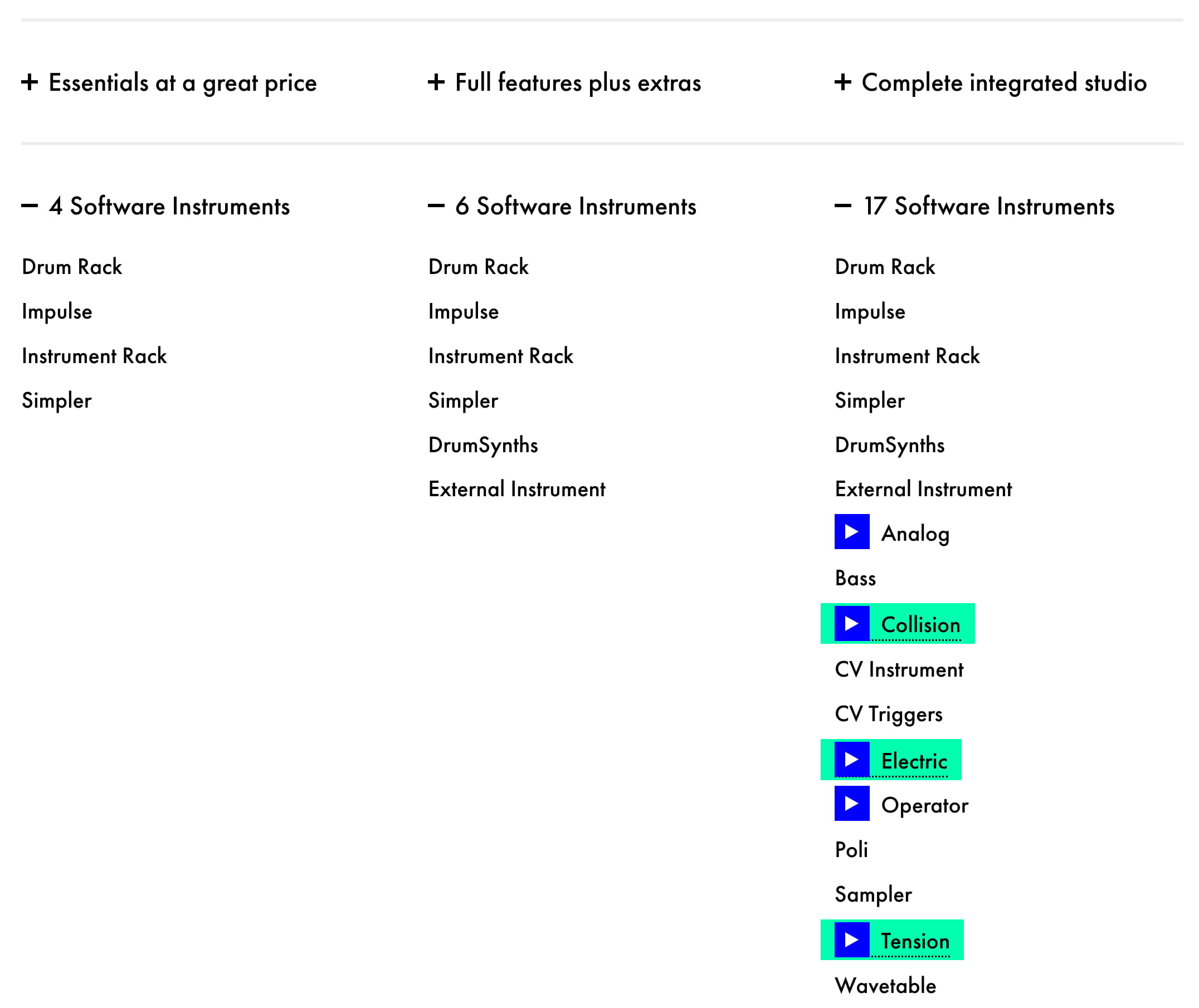 On Ableton, all attributes are also grouped into accordions. Instead of using a chevron on the right, the + icon is used on the left. A click on any of the items opens a card for the entire row.