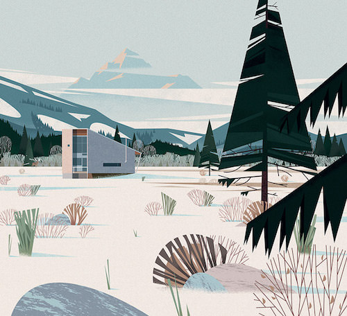 The blocky geometric shapes and flat colors are joyful and confident, but a certain restraint of going too detailed. They fully illustrate the natural silence and placidity of a cabin in the woods.