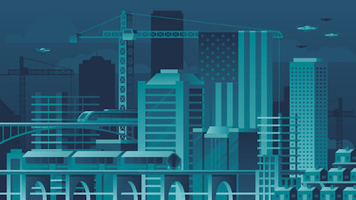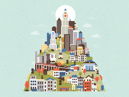 Much to like here in this custom illustration. Architecture plays a leading role in this piece with some of the more iconic buildings like from Yale, Chicago, and New York to create the cityscape. The face you see in the top tower is a nice touch.