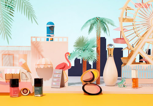 This new work for Ici Paris XL is using miniature versions of Miami and Santa Monica created in cardboard. The products are the actors in the artwork and they blend in so nicely. Nice use of colors!