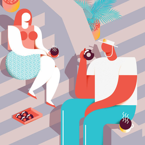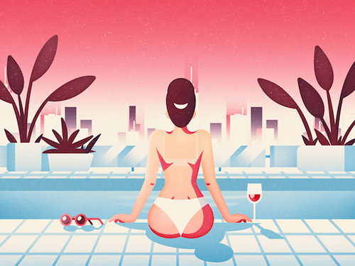 Bold geometric shapes, bright colors, and voluptuous vacationing characters are giving this illustration a whimsical and sultry personality.