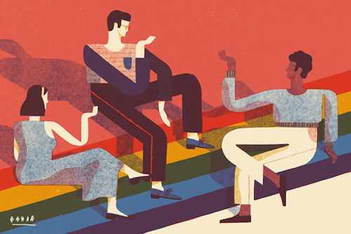 Illustration for The New York Times about an article that talks about how the same-sex marriage effort found a way around polarization. The legs and arms are such an eye-catcher here. I love the geometry and the way the colors are applied.