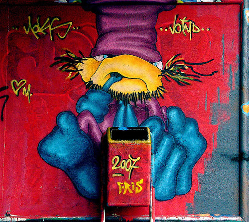 Probably the most prominent graffiti artist is Banksy, a famous pseudo-anonymous British artist whose works focus on topics such as politics, culture, and ethics. His art has appeared in cities around the world; it’s worth mentioning that Banksy does not sell photos of street graffiti or mount exhibitions of screenprints in commercial galleries. You can explore Banksy’s works in the Time’s slideshow The World According To Banksy. However, many different artists explore graffiti in a variety of ways.