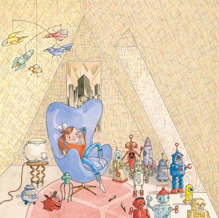 Wonderful book cover for Sleeping Beauty, a mid-century fairy tale. Original pattern on the background, and who doesn’t love robots.