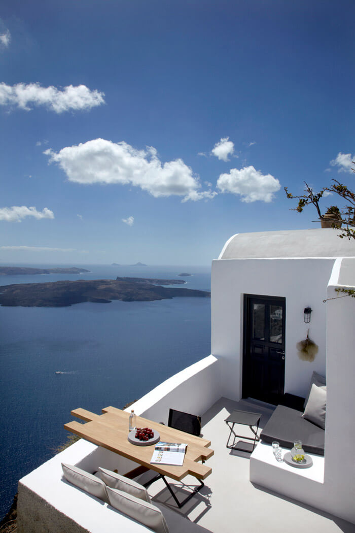 A view from an upscale hotel carved into the cliffs overlooking the Santorini Caldera. You sure would want to escape winter after seeing this.