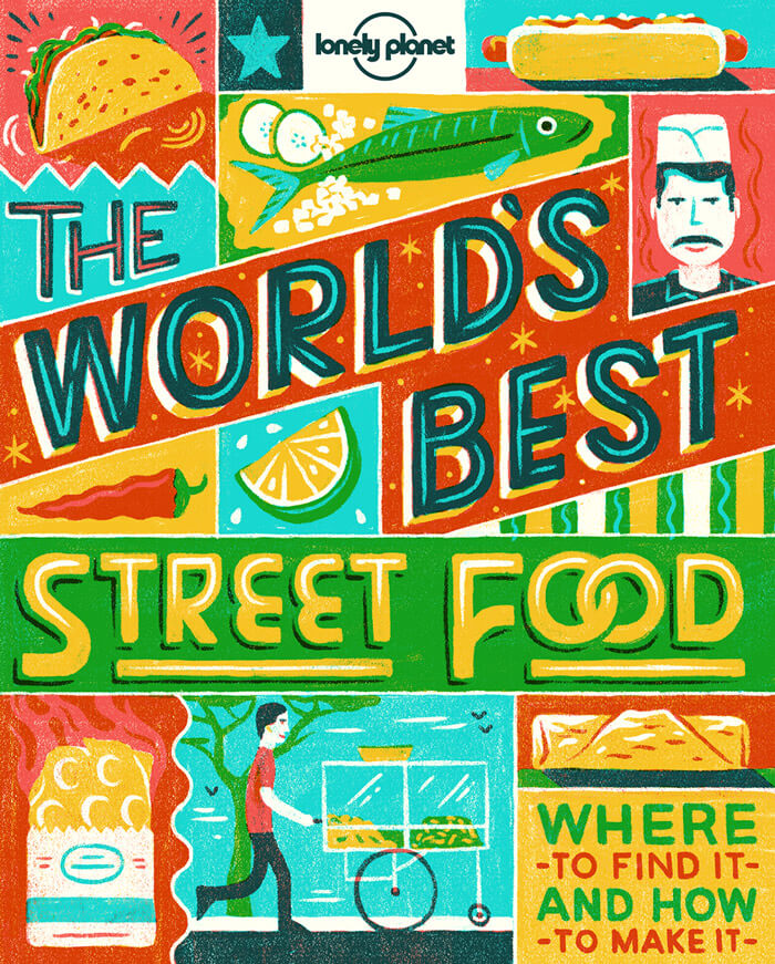 Illustrated cover for a Lonely Planet guide. The grunginess is inspiring and the colors work well with the hand lettering feel.
