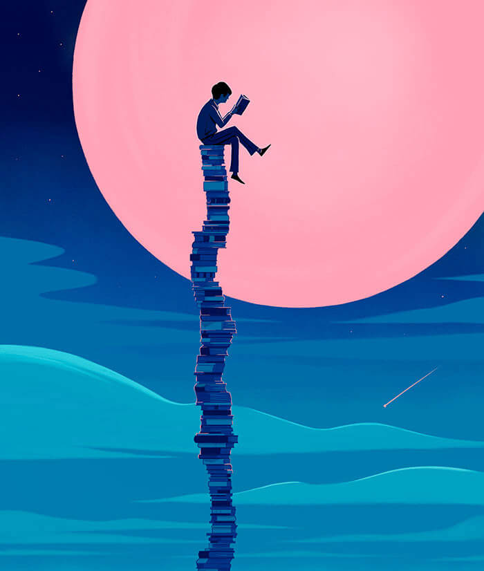 Cover for The Guardian Review books. Love the concept of a huge book pile in front of a giant moon. Nice contrast of the figure in front of the moon.