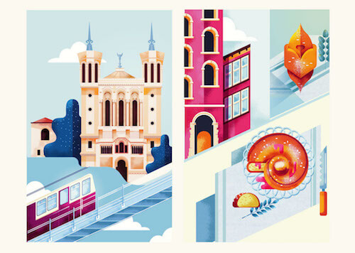 Illustration for the Eurostar Lyon campaign. Lyon, the city of 2 rivers, the belly of France, of food & wine. The food looks super delicious I must say. Admiring the textures & color choices.