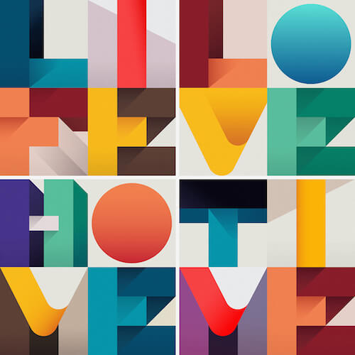 A very colorful 4x4 typographical illustration about the 4 elements on which human existence is based: Life, Love, Home, Time. There’s a great system at work here. The color combination and 3D effect is very well and cleverly done.
