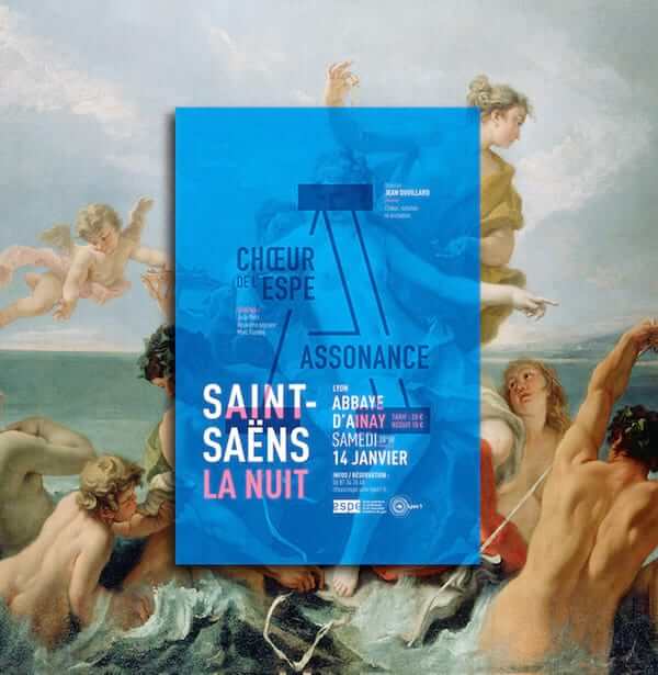 Visual identity of the “ESPE - Assonance Choir”, mixed choir of over a hundred people. This identity is mostly developed on the posters of the concerts. On every poster, the logo appears in a big size at the center and is used as a grid. In the background, classic paintings illustrate the theme of the concert. Wonderful usage of overlay effects!
