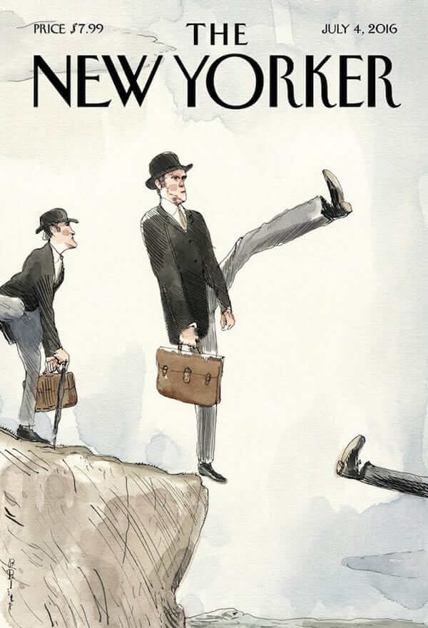 Brilliant cover for The New Yorker based on the famous sketch of the Monty Python comedy television show ‘Monty Python’s Flying Circus’. Created for the Brexit cover story: Barry Blitt’s “silly walk off a cliff”.