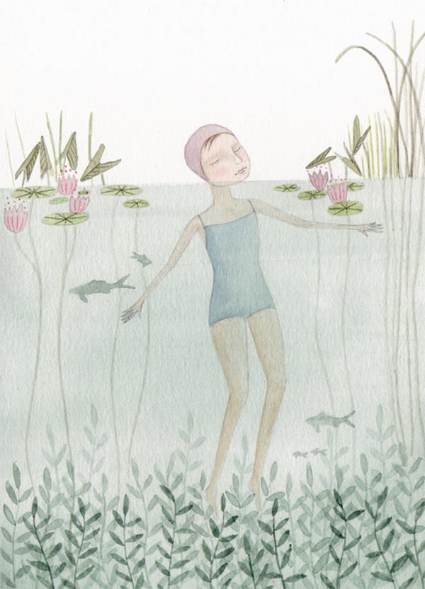 I’ve always been a fan of watercolor pencil style drawings, plus I like to swim. This illustration scores on both. The pastel colors, the subtle blush on the girls cheek, it’s all just right. Here’s to a Summer with many swimming opportunities.
