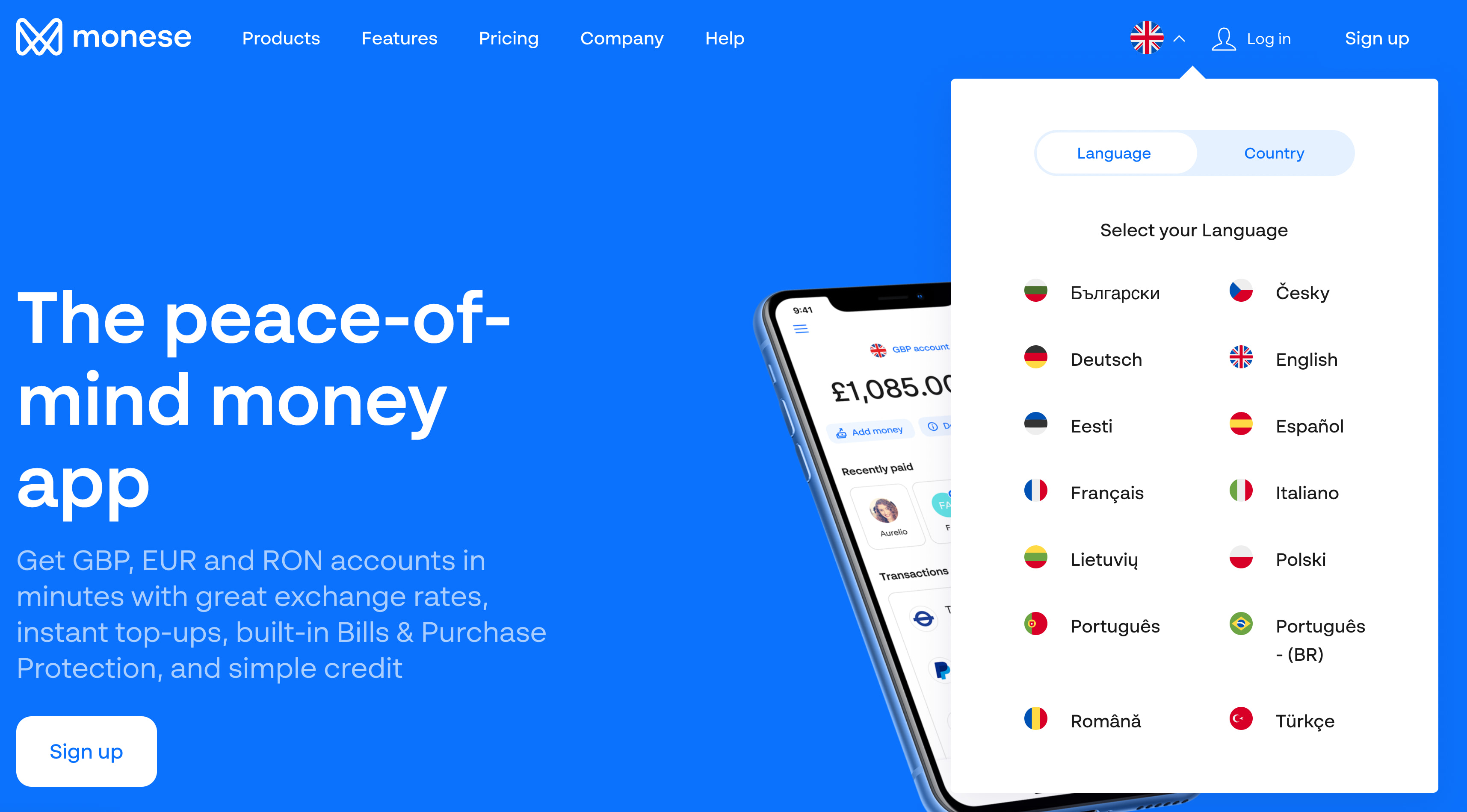 Monese shows two tabs in the right upper corner of the header. Users can switch between language and country, defining preferences for each separately.