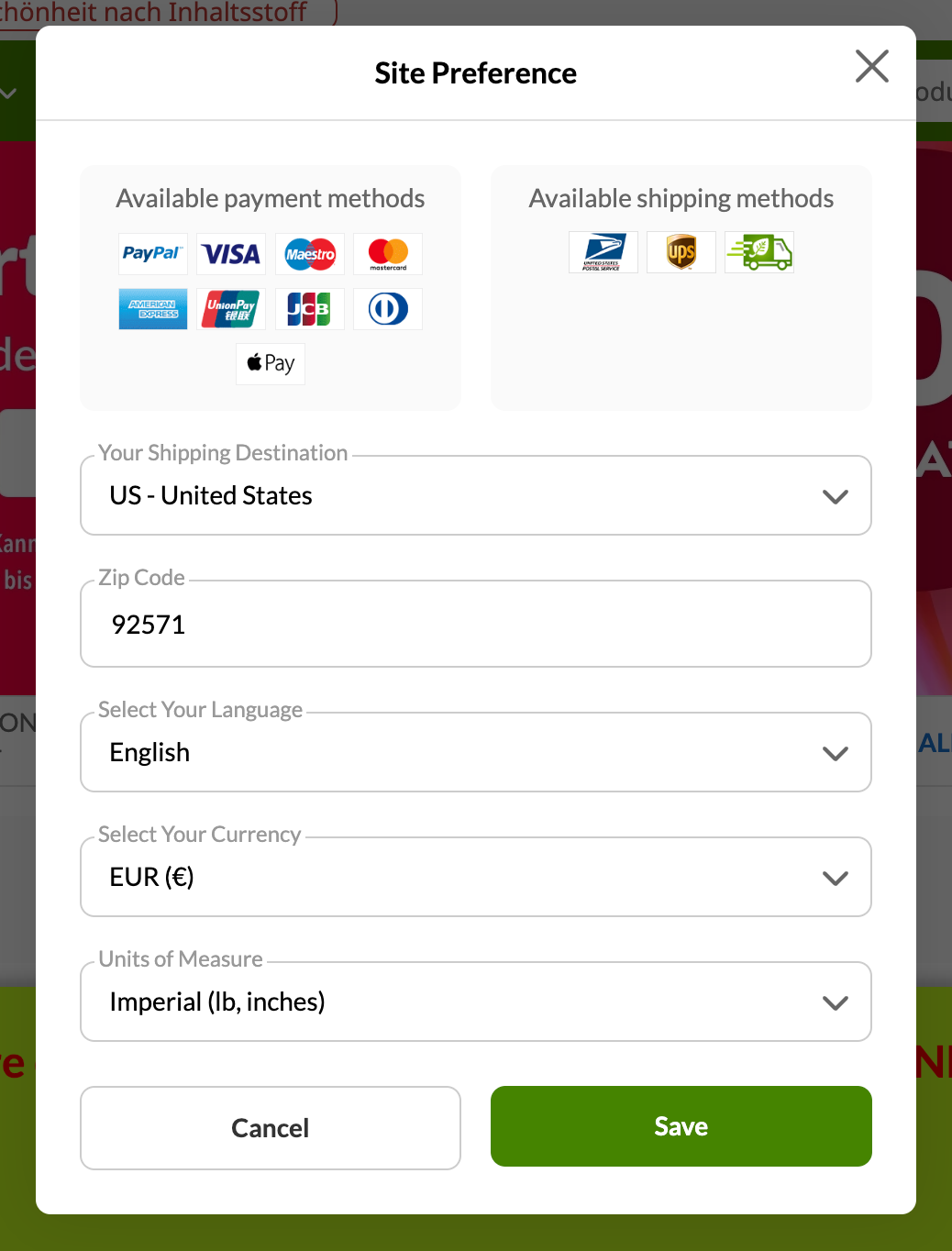 iHerb goes the extra mile by providing a whole range of additional preferences for their users. Not only can users choose their language, preferred currency and shipping destination (and specify it with ZIP code for US destinations) — they can also choose preferred units of measure and check available payment methods and available shipping methods. Bonus points for smart autocomplete input rather than a not-so-good old-fashioned <select>-dropdown.