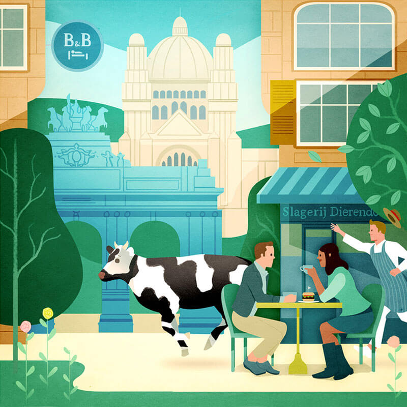 Illustrations for Eurostar’s Metropolitan magazine to accompany an article about what to see and do in Brussels. The butcher chasing the cow is such a nice detail.