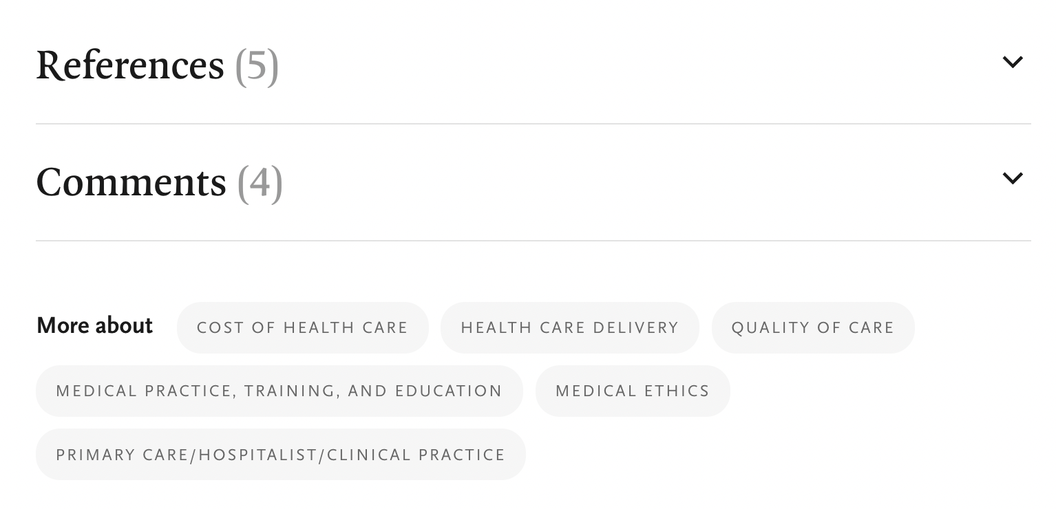 At the first glance, it’s difficult to say where exactly one is on the New England Journal of Medicine. There isn’t a clear label for the current category that one would immediately understand. If you’d like to explore more related articles, how would you navigate there? As it turns out, “Perspective” above the heading is actually a category and a link to that category, but because it’s appearing in light grey, it doesn’t look like an interactive element. To explore more, we’d need to click there, yet it’s not necessarily obvious to everyone.