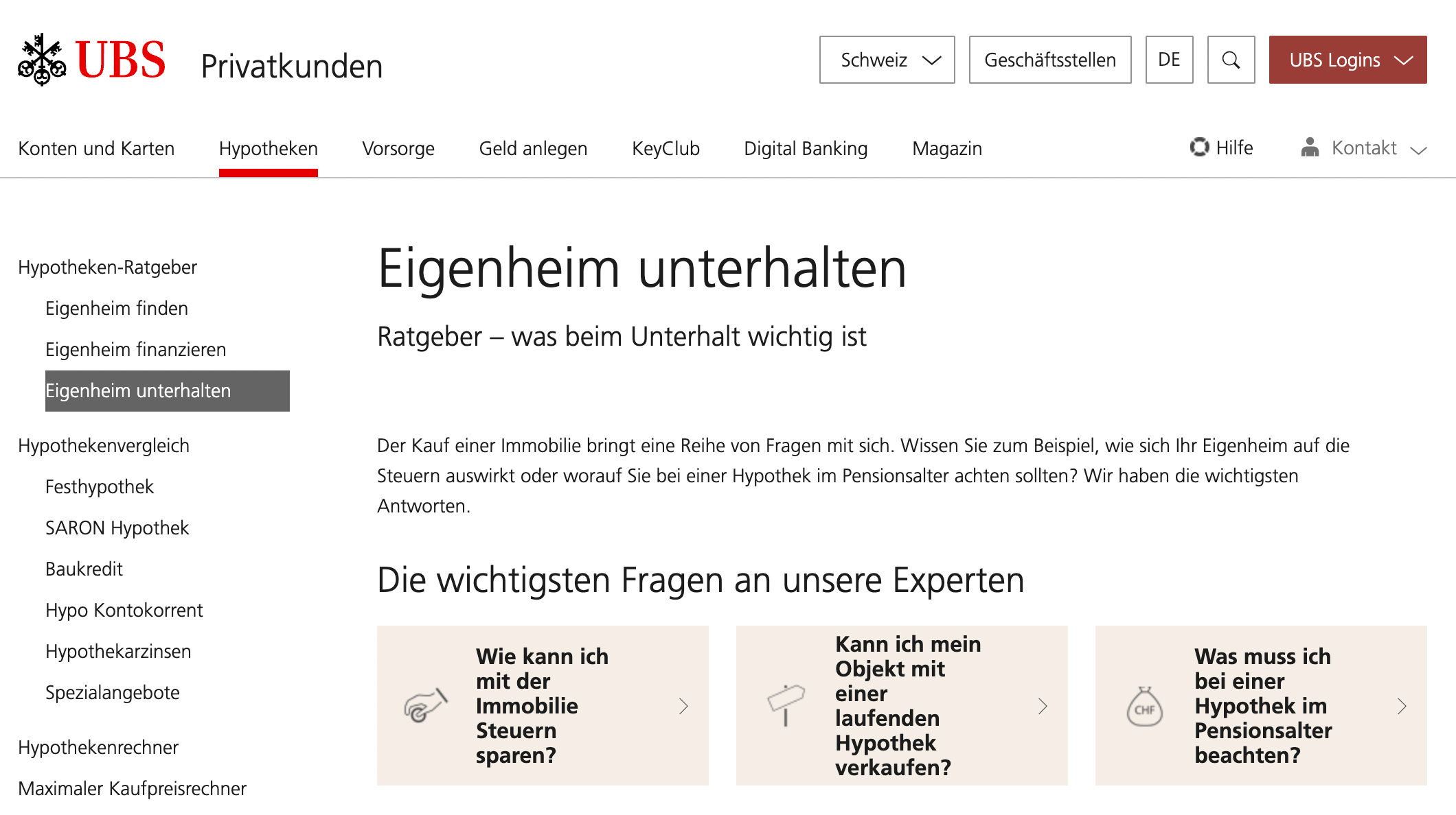 A similar website, a similar industry, but organized slightly differently: SwissLife. There are multiple levels of navigation on the top, with breadcrumbs above the heading and placed on top of the image. Unlike in the previous example, here the header is more useful — just also unfortunately much more difficult to read. The text could live on a darker background, for example. The overall design pattern though seems to be quite right, now with useful content appearing right in the header area.