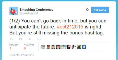 Well, that last hint was sent out by the @SmashingConf account, and the riddle is dedicated to the SmashingConf NYC 2015, so maybe the reference for “coming back” is related to SmashingConf? But if you’ve never been to a SmashingConf, how can you come back to it? Well, you can come back to the future with DeLorean, so perhaps we are looking for the clue of a future event? In fact, maybe our mysterious character is so eagerly waiting for that next event that it stubbornly attempts to solve an equation to get back to 21⁄10?