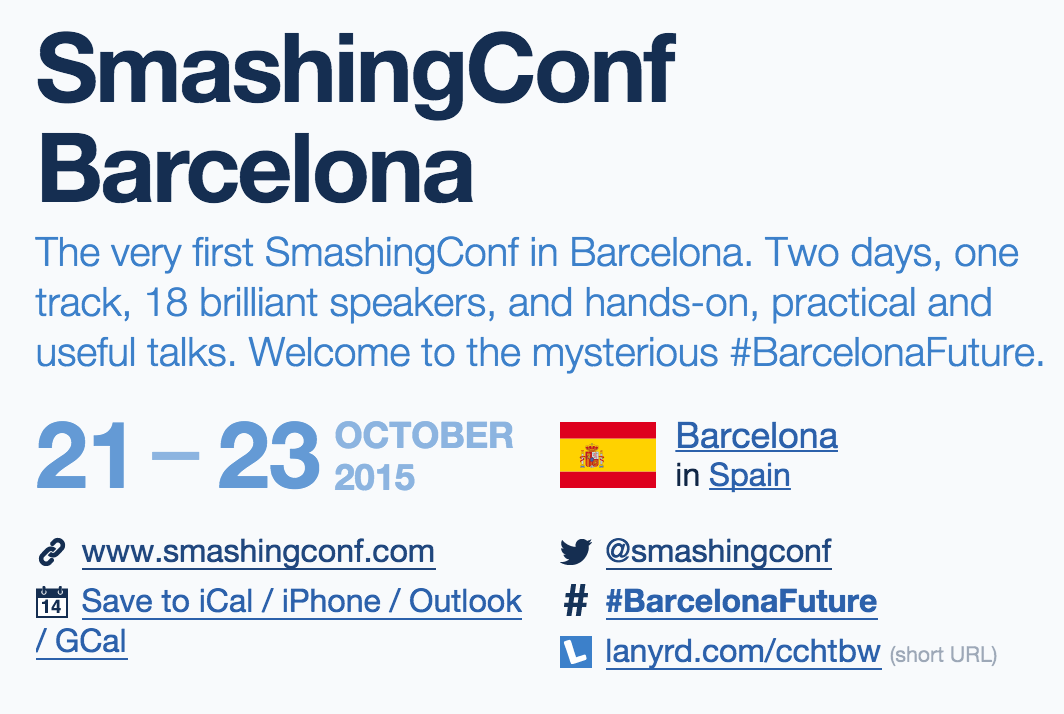 SmashingConf NYC is taking place on June 15–18, 2015, so it can’t be right. But wait a second… perhaps there is something else happening on October 21st? With a little bit of experimentation, luck and clever search requests, you should be able to end up on a Lanyrd page for SmashingConf Barcelona 2015, taking place on October 21–23, 2015. Now, that escalated quickly! This could all make perfect sense, wouldn’t it? Could this be the final clue that we’ve been looking for the entire time?